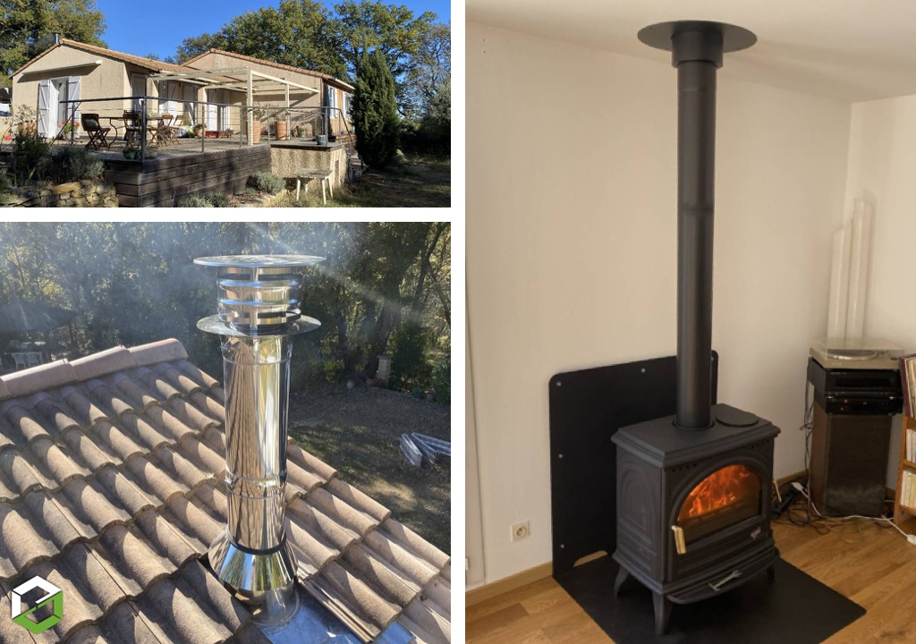 Depuis la buse du poêle, mise en place d’un tuyau en acier noir de 2 mm d'épaisseur Ferrolux raccordé sur le conduit en inox Dweco de chez Jérémias France avec élément de finition noir, plaque d'étanchéité à l'air, coquille isolante, collier de soutien, support au toit, solin plomb, larmier et chapeau anti pluie vent
