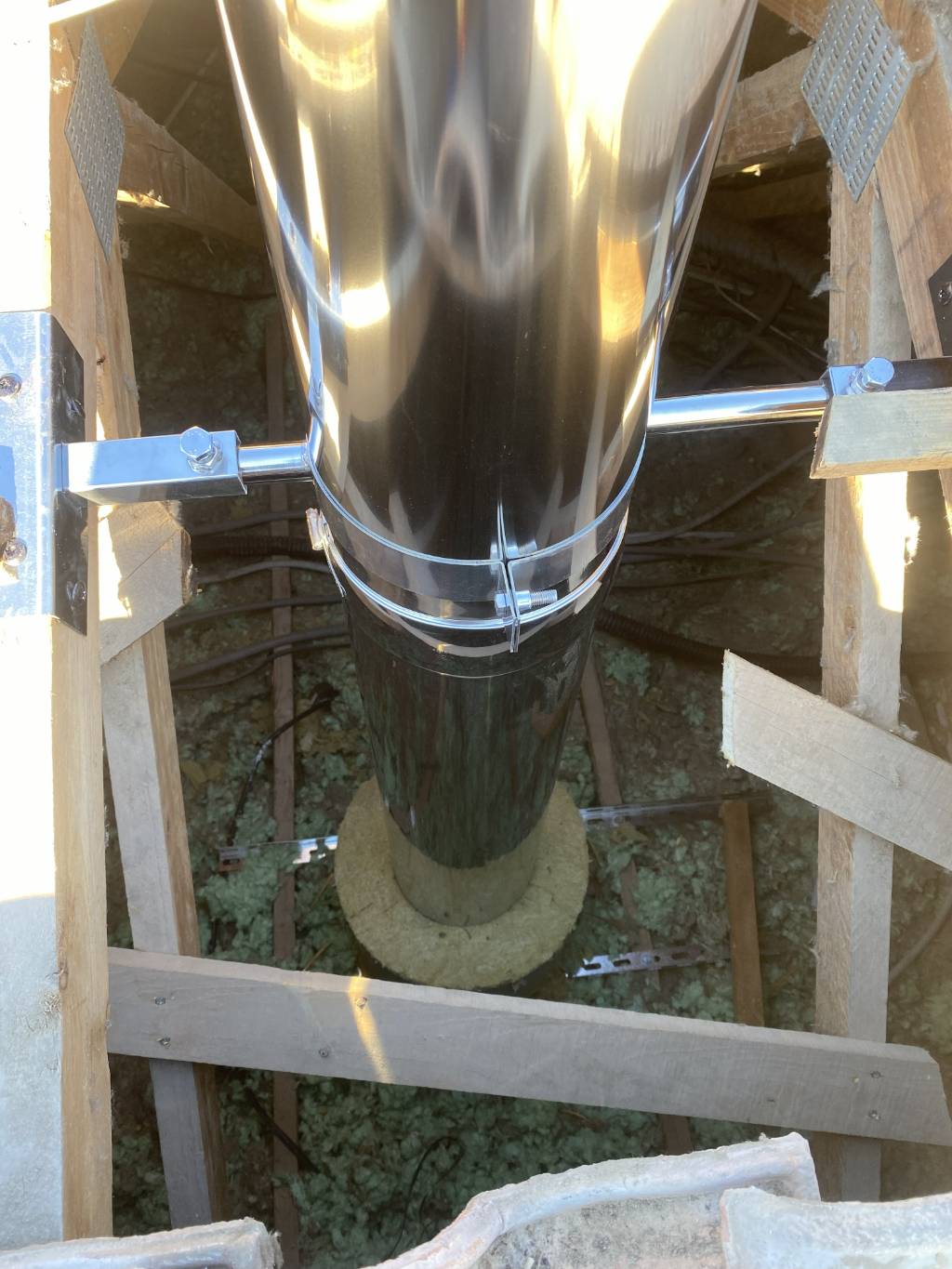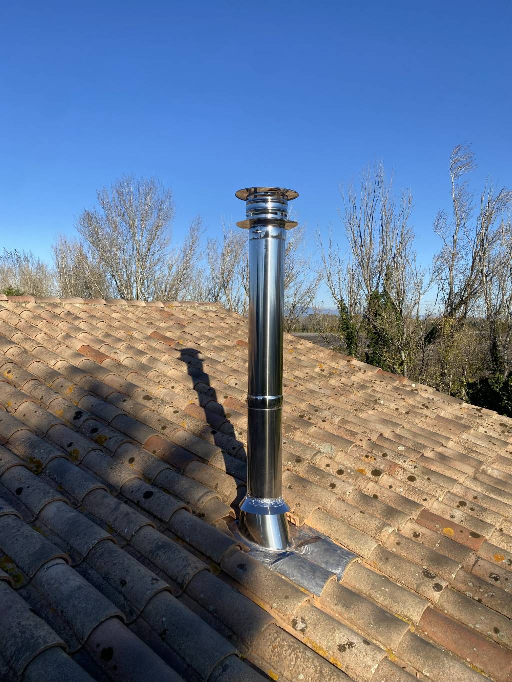 Depuis la buse du poêle, mise en place d’un tuyau en acier noir de 2 mm d'épaisseur Ferrolux raccordé sur le conduit en inox Dweco de chez Jérémias France avec élément de finition noir, plaque d'étanchéité à l'air, coquille isolante, collier de soutien, support au toit, solin plomb, larmier et chapeau anti pluie vent