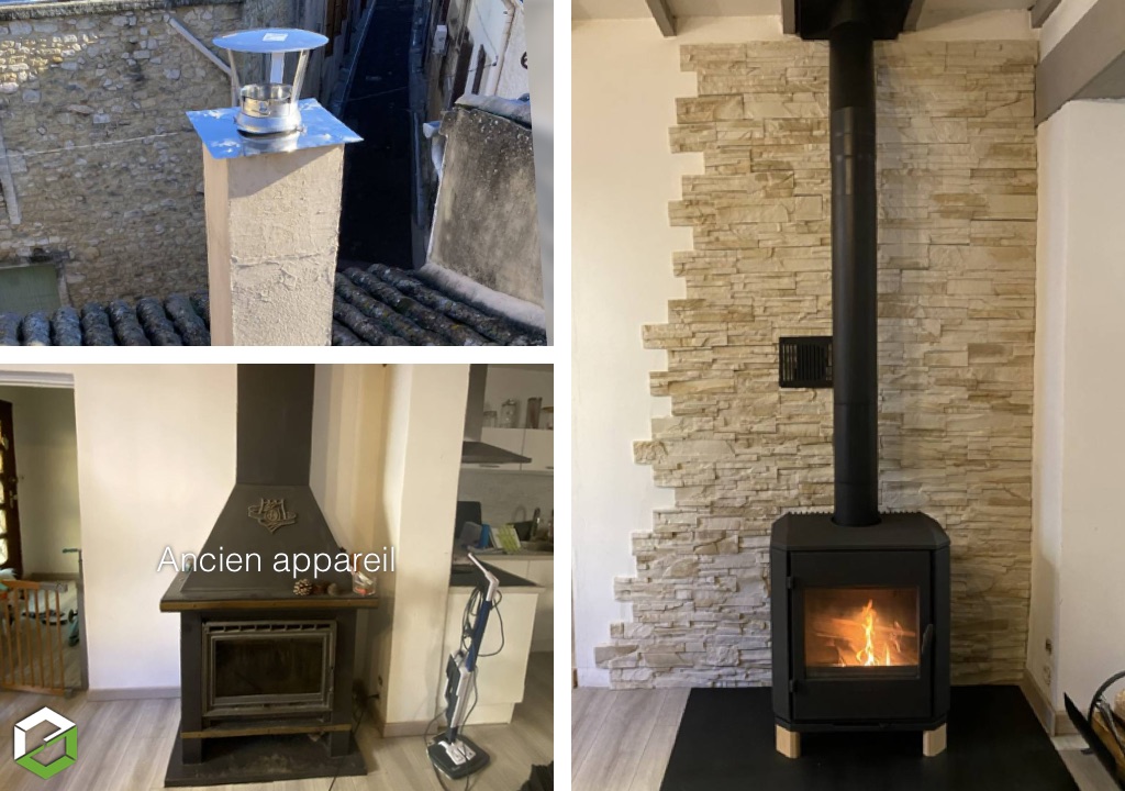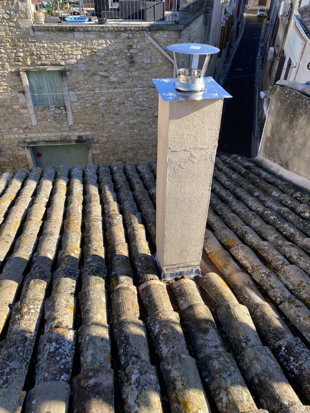 Après un bon ramonage du conduit existant, tubage de celui-ci réalisé en flexible inox double peau de chez Jérémias France, puis fermeture du haut du conduit par une plaque inox ventilée et d’un raccord à visser sur le haut du tubage.