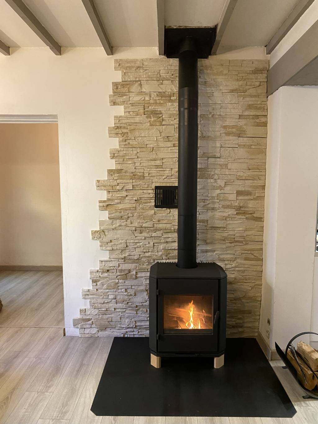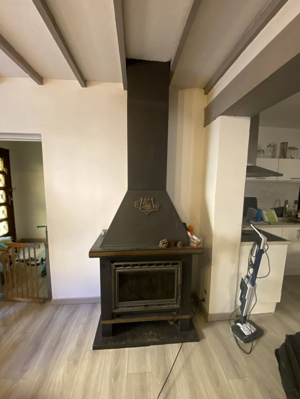 Après avoir déposé l'ancienne cheminée, Installation d'un poêle à bois en fonte de fabrication française, modèle Carola Zen, de marque Invicta. Ce poêle à bois (bûches) d’une puissance nominale de 8 kW permettra de chauffer cette pièce et une bonne partie de la maison.
