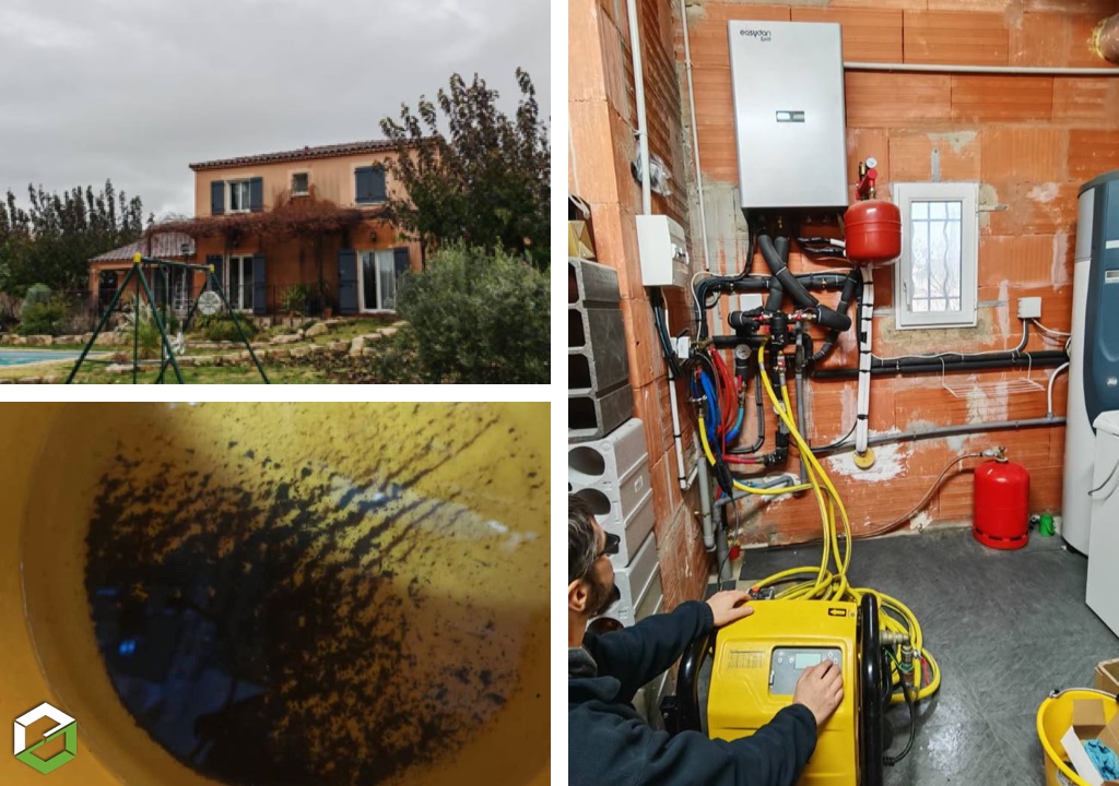 Pose d'un pot à boues sur la tuyauterie retour et d'une vanne by-pass sur l'aller, puis désembouage effectué avec une machine spéciale injectant de l'air et de l'eau par intermittence, ce qui a permis de restaurer les performances initiales de l'installation.