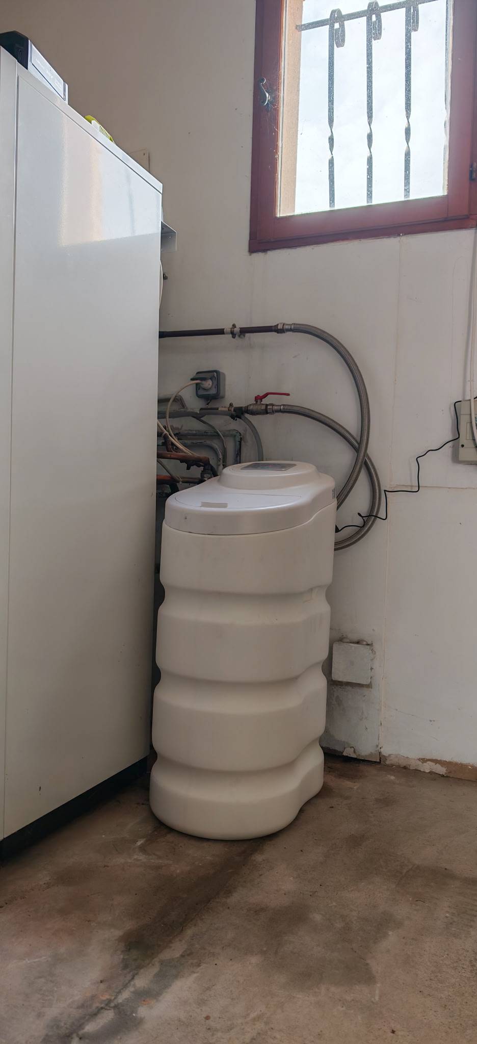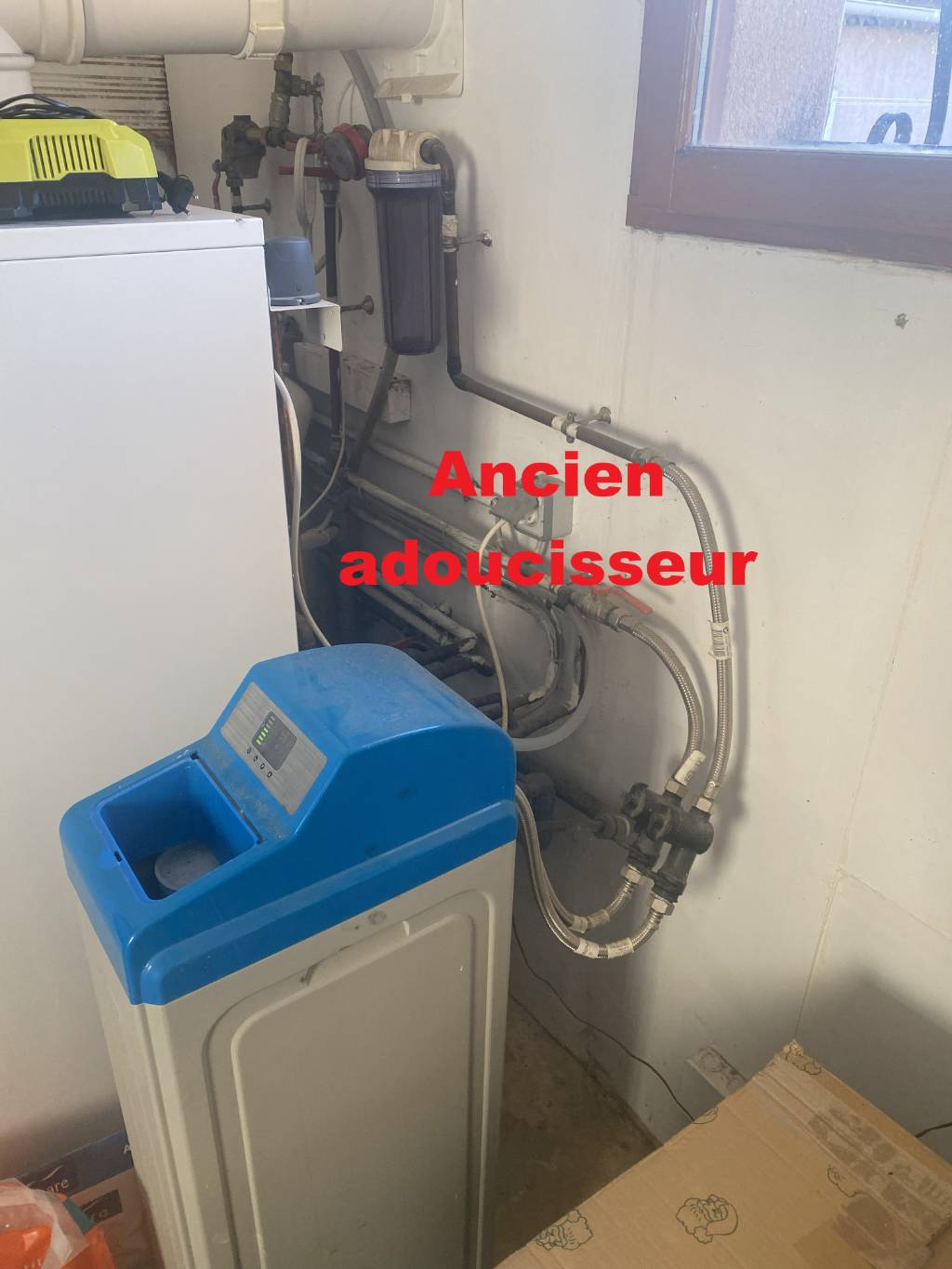 Remplacement d’un ancien adoucisseur sur installation existante, mise en place d’un adoucisseur volumétrique mono-colonne de chez DS Water, modèle Compacto 24 litres, et remplacement de la cartouche du filtre existant.