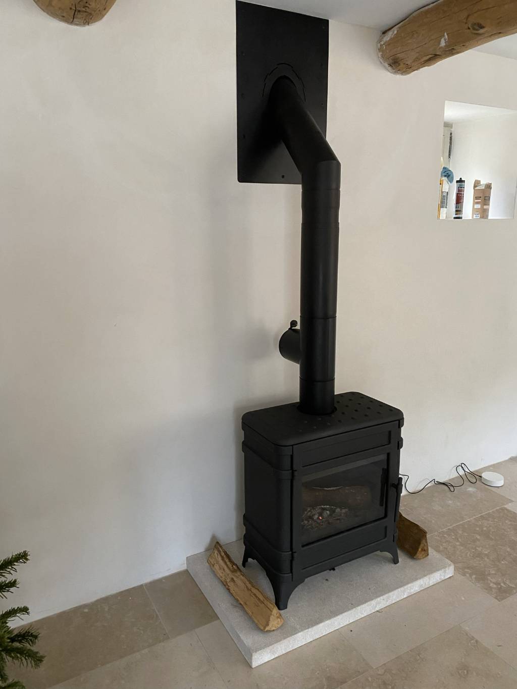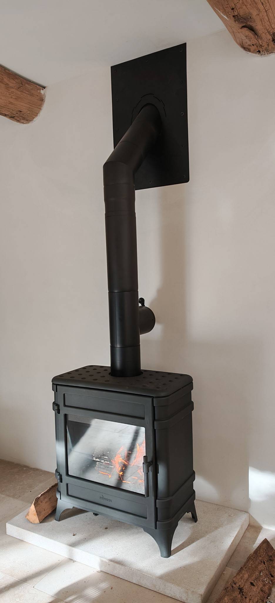 Dans cette ancienne maison de village en rénovation, Installation d'un poêle à bois tout en fonte de fabrication française, modèle Siam de marque Invicta. Ce poêle à bois (bûches) d’une puissance nominale de 12kW permettra de chauffer confortablement cette pièce et une grande partie de la maison.