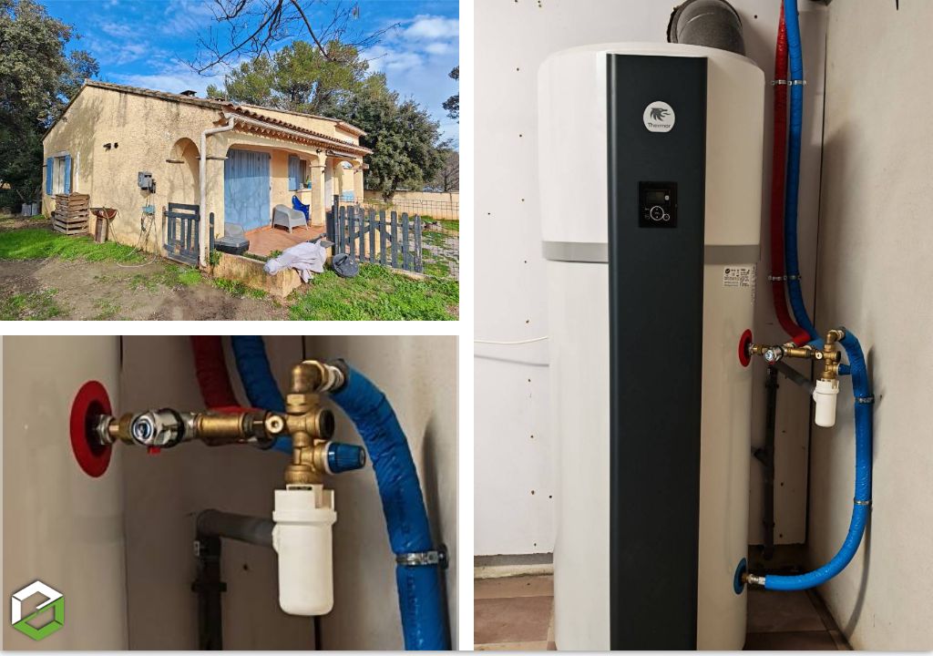Afin de réduire sa facture d'électricité, cette nouvelle cliente a souhaité en remplacement d’une chaudière gaz, l'installation d'un chauffe-eau thermodynamique de 200l sur air ambiant de marque Thermor Aéromax 5, avec gaine de refoulement isolée de marque Ubbink et sa sortie en façade avec une grille boule inox