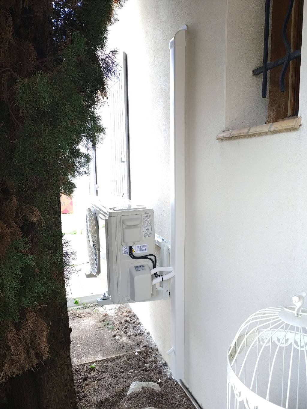 Raccordements électriques et évacuation des condensats en écoulement libre extérieur pour un arrosage gratuit du cyprès.