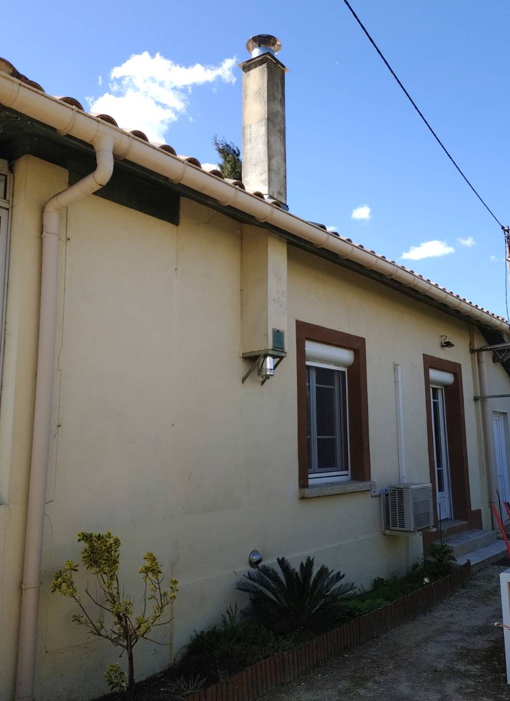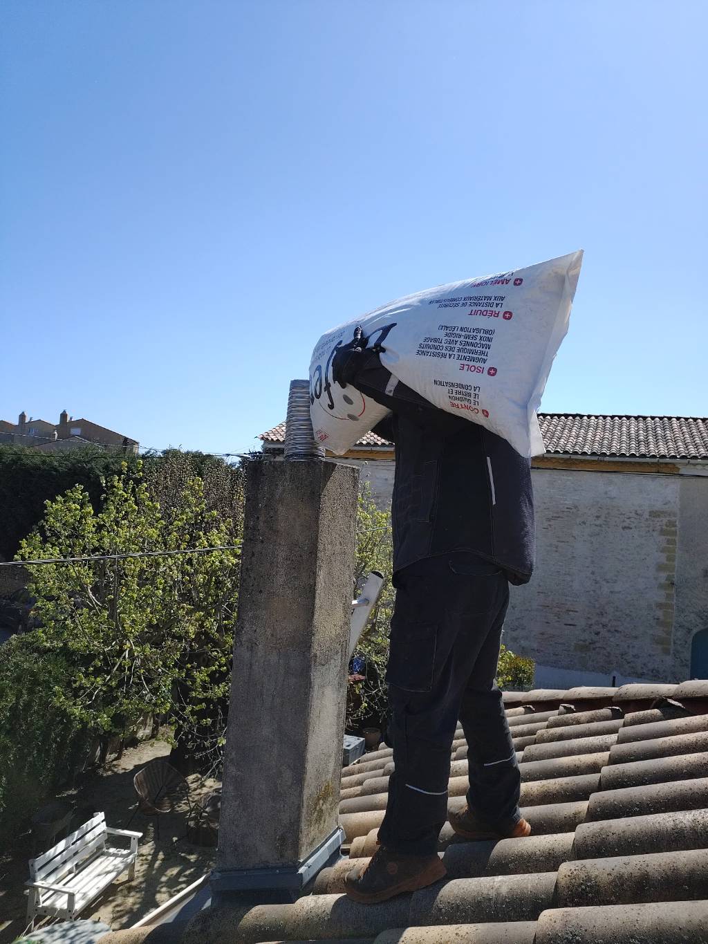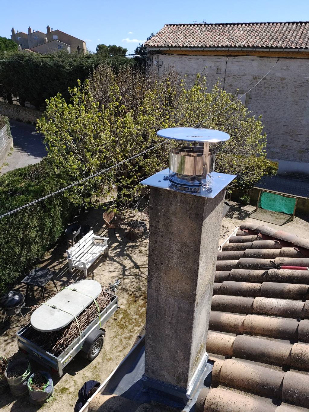 Ramonage et tubage du conduit existant avec flexible inox double peau de chez Jérémias France avec chapeau anti pluie/vent, té de visite en bas du conduit et remplissage de l’espace entre le tubage et le boisseau avec du Biafeu.