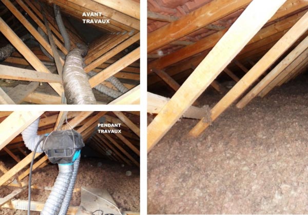Aprés dépose ancienne laine de verre, mise en place d'une VMC simple flux Hygro A de marque Atlantic, puis soufflage de laine de roche de marque Rockwool sur une épaisseur de 430mm soit un R=9,5